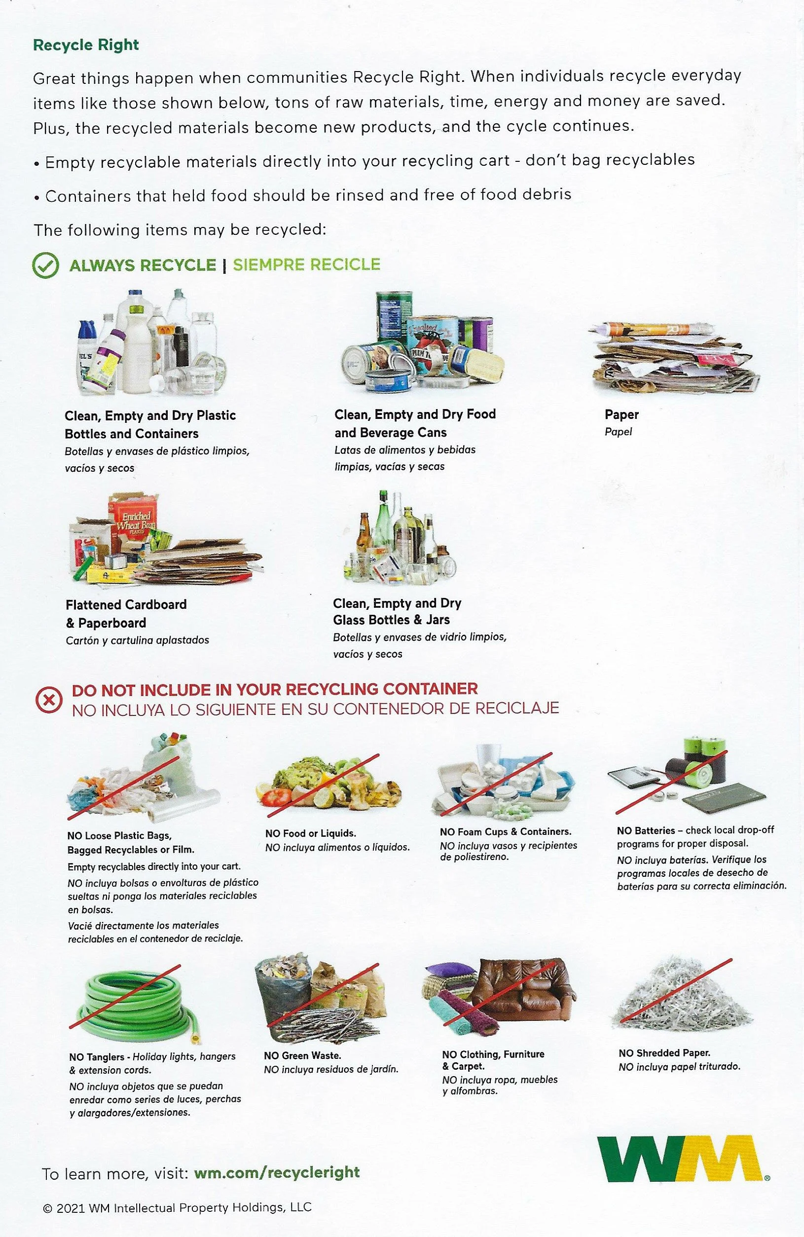 Waste Management accepts some items that previously had not been accepted. Included in this list are dairy and juice cartons as well as plastic containers (#1-#7) such as yogurt and sour cream containers. Lids on those items are also accepted and should be left ON the container. For residents that shred documents, shredded paper is accepted in a paper bag with the top stapled or rolled shut. Paperback books are also accepted.